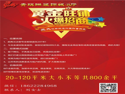 | 贵琪琳装饰城, 建成已有十余年,是汉沽最早之一建材装饰成,现拥有大批 固定客户,现因装中央空调,装饰城B厅现空余多个摊位, 从20-125平米面积不等的摊位。B厅将在以后实行网络+实体 共同销售的模式,建立独立网站、58同城、58同城、纸媒等 一系列免费宣传方式,并教授租户们如何通过网络的形式推 销自己的产品,使租户们能多种渠道推广产品。